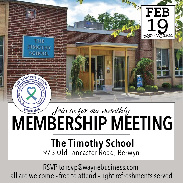 The Timothy School will host a happy hour for the WBA on 02/19/26 from 5:30-7:30pm. Hear from our host, learn about what is happening around Wayne and meet other business people for our community. Light refreshments will be served, all are welcome, free to attend. RSVP by 02/16/26 to rsvp@waynebusiness.com